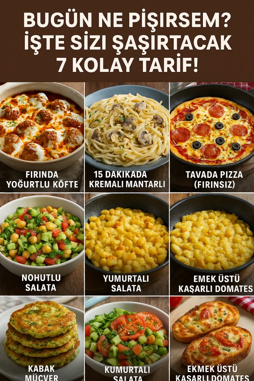 Bugün ne pişirsem diye düşünenler için kurtarıcı olacak 7 kolay tarif önerisi burada! Evdeki malzemelerle zahmetsiz ama lezzetli sofralar kurmak isteyenler, bu listeye bayılacak. Anahtar kelime: bugün ne pişirsem.
